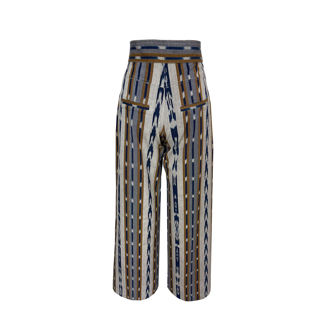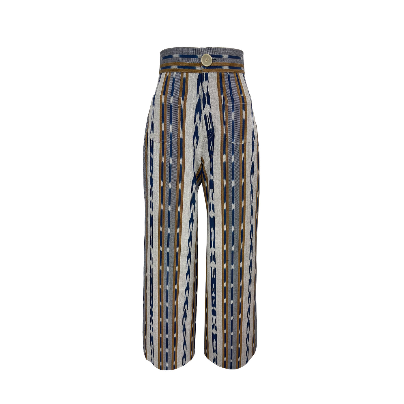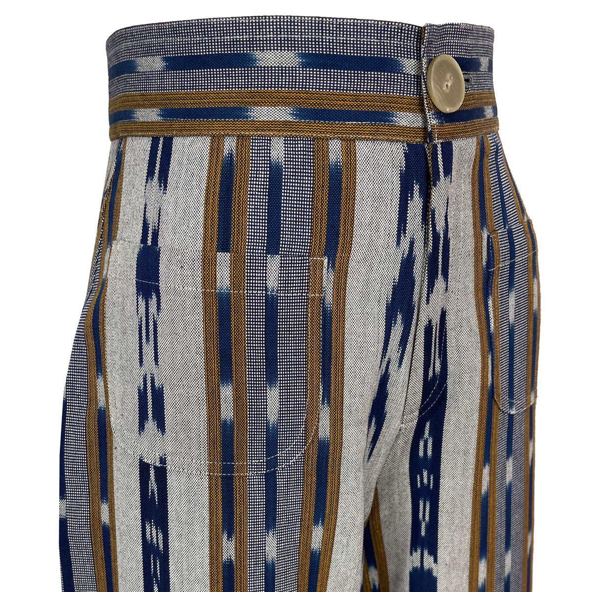 The high waisted Niebla Pants are crafted in handwoven double ikat cotton from South India. It features woven stripes in earthy tones of blue and brown, front patch pockets and a bone button closure. It's a versatile piece which pairs perfectly with crisp shirts or relaxed knits.