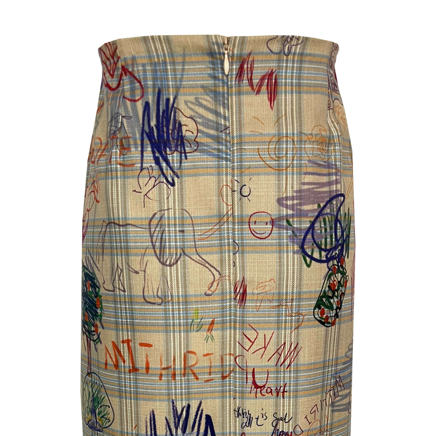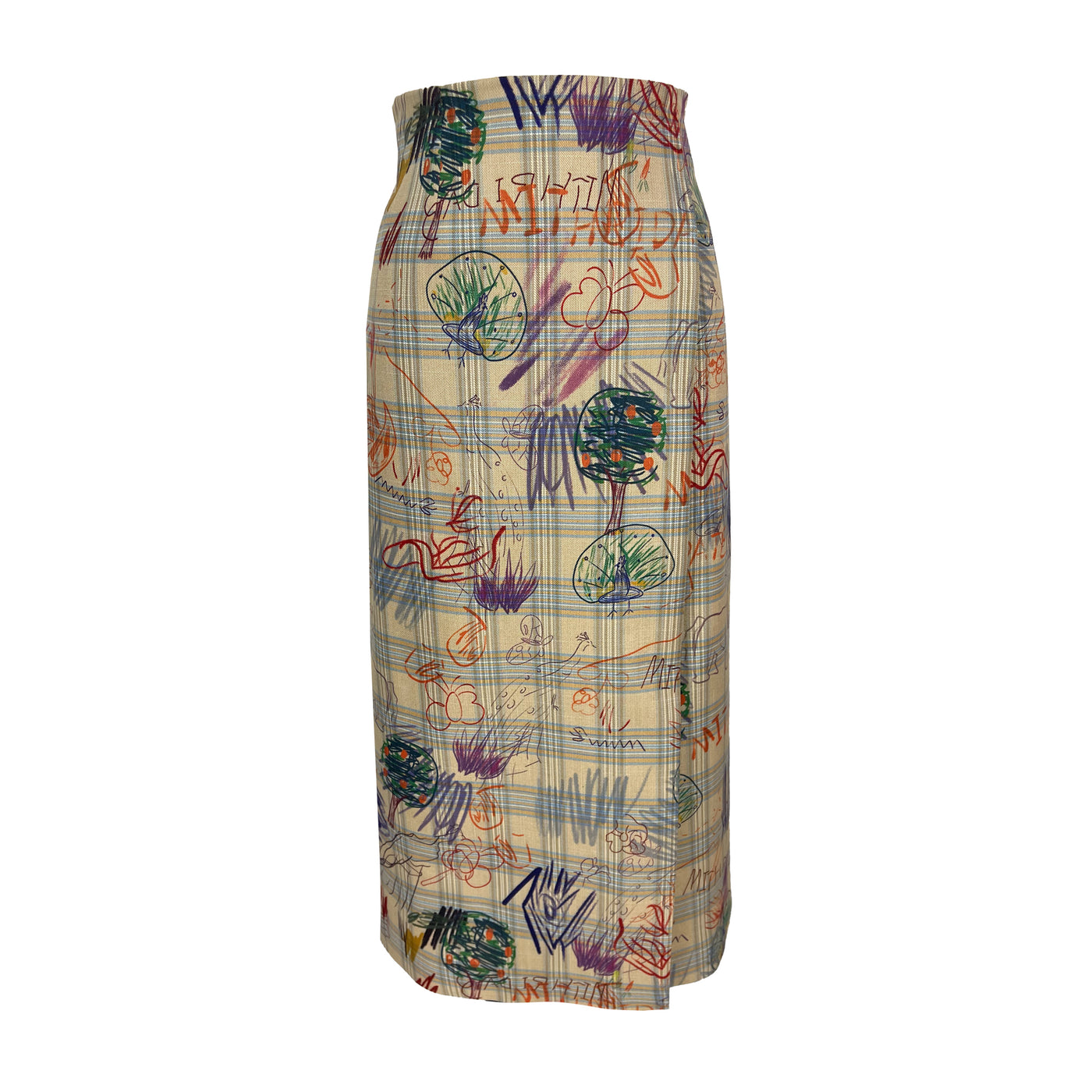 Introducing the Playground Plaid Skirt, a one-of-a-kind skirt meticulously designed with a beige plaid pattern, adorned with playful child art and doodle motifs in vibrant colors. This A line skirt features a wrap around silhouette with back concealed zipper closure.