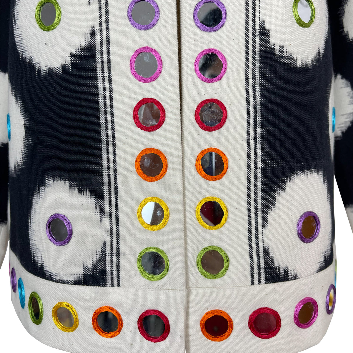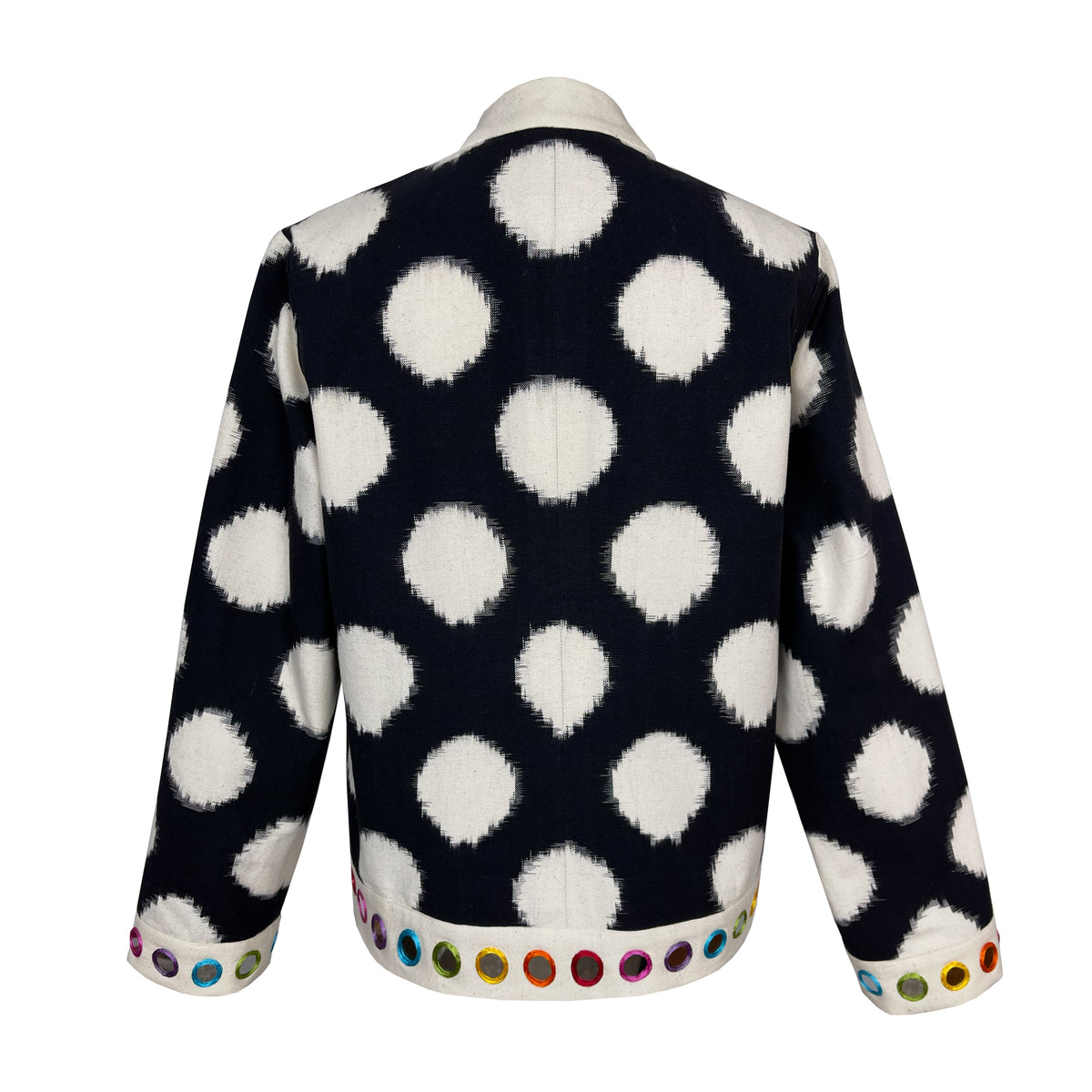 The Mutlicolor Mirror Jacket is made from premium handloom Ikat fabric, featuring a classic black and white polka dot pattern and multi coloured mirror hand embroidery. Finished with a structured fit, high neck collar, and artisan detailing, it’s perfect for festive occasions or chic everyday wear.