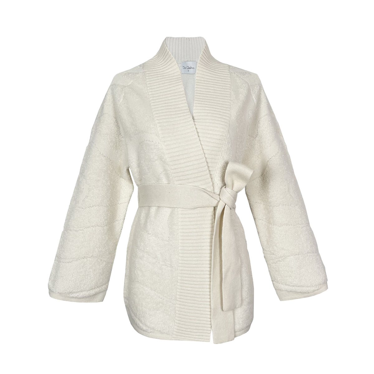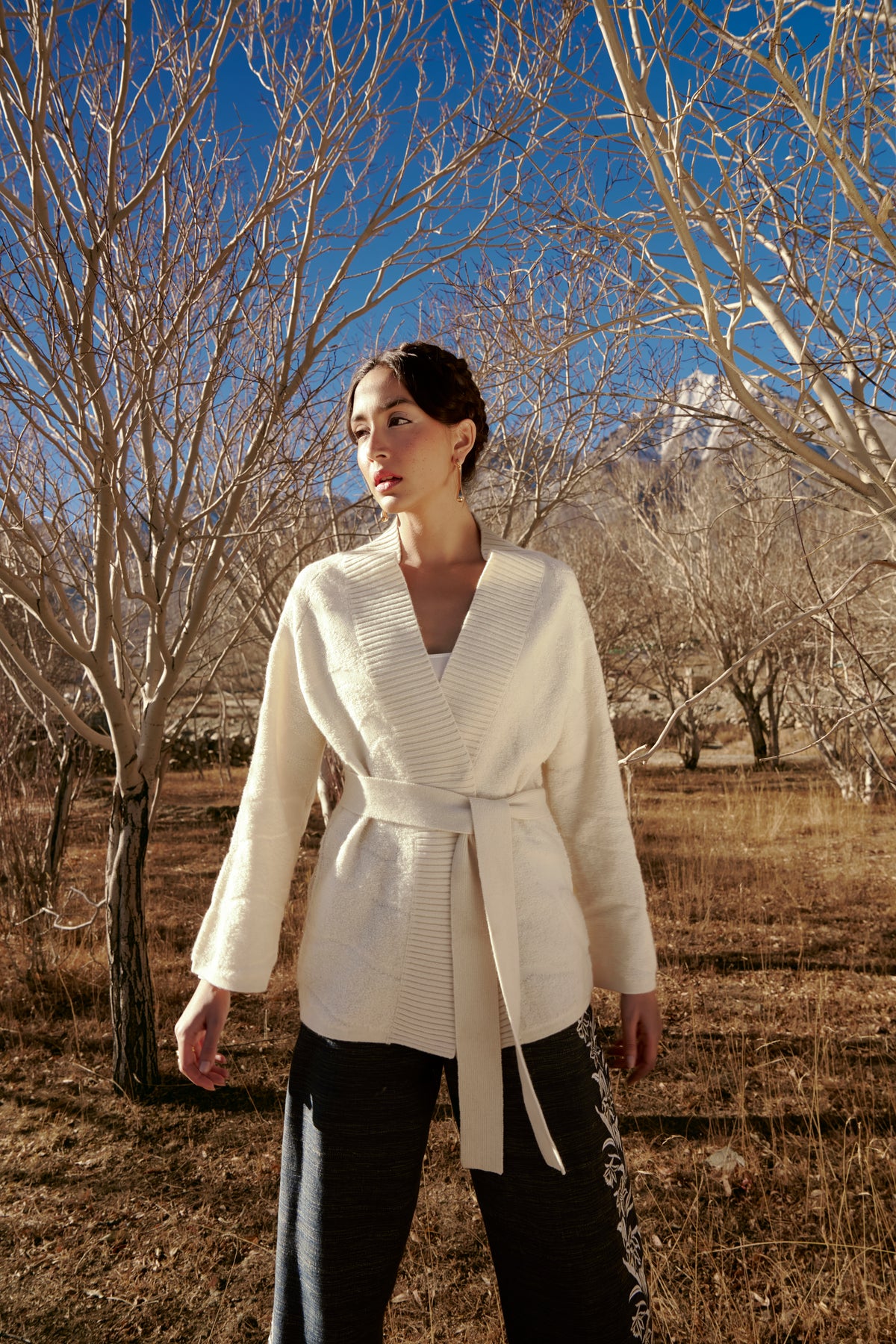 Crafted from pure Cashmere, the Ivory Cloud Kimono brings together luxury and functionality. The relaxed silhouette features ribbed detailing in the front and a detachable waist belt. The soft, luxurious texture of cashmere drapes beautifully, offering warmth without weight.