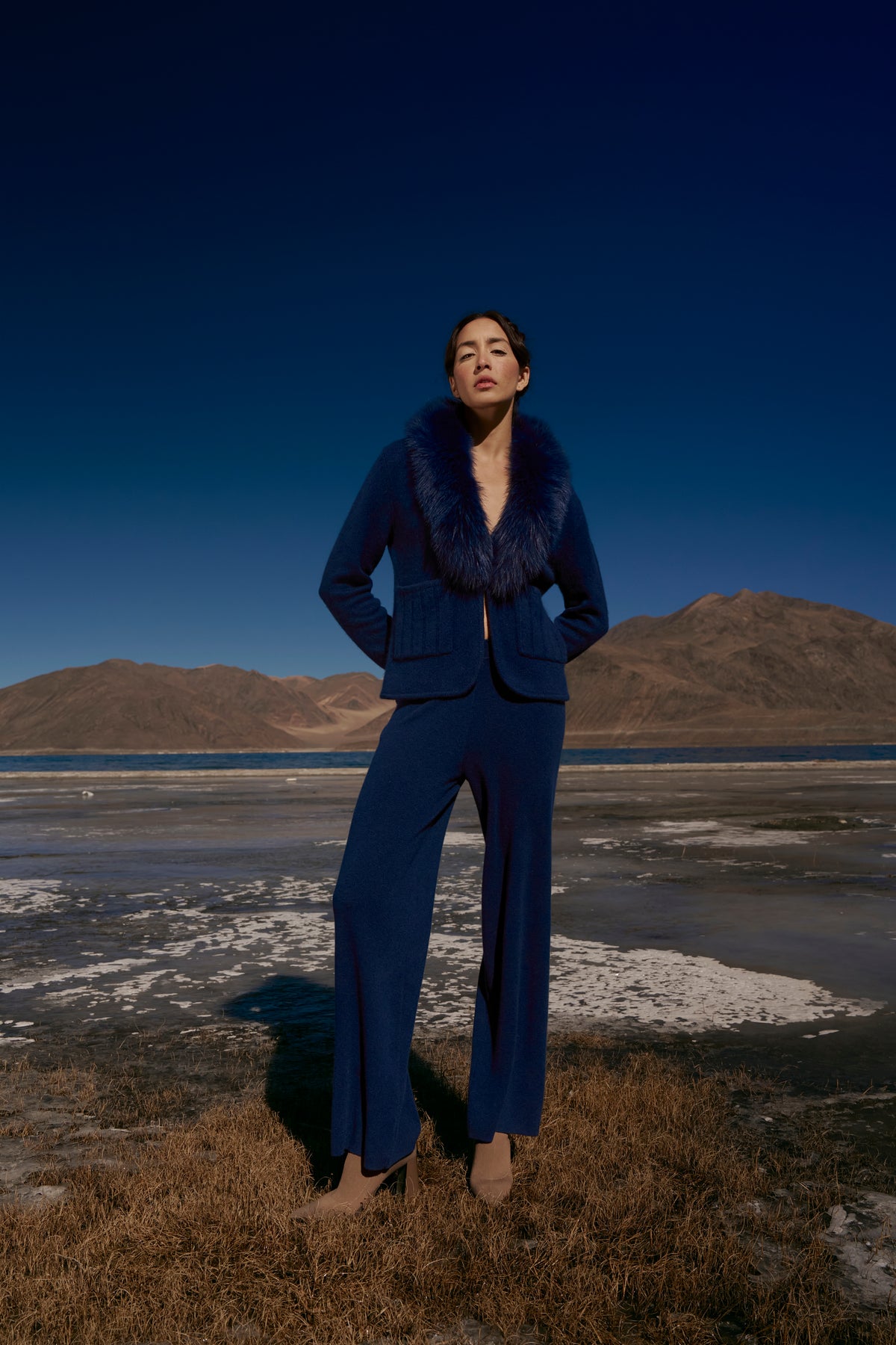 The Blue Empress Trousers is crafted from pure Cashmere, redefining comfort. It offers a feather-light feel while keeping you warm and cozy. The relaxed straight fit features elastic waistband and soft knit fabric. It pairs seamlessly with tops, cardigans or outerwear.