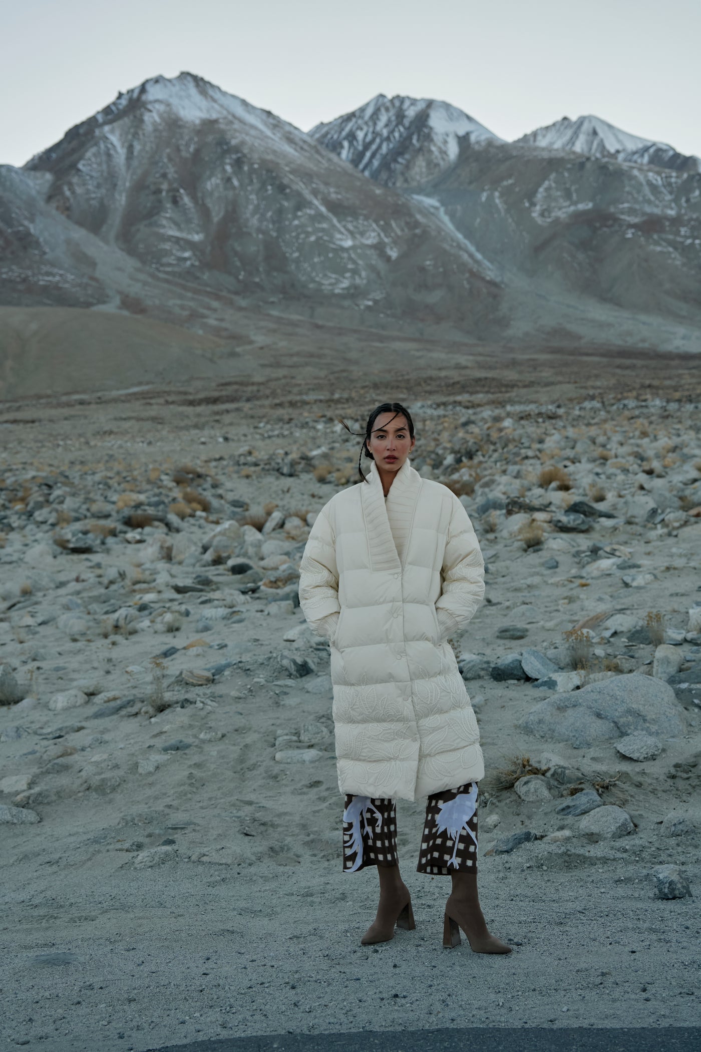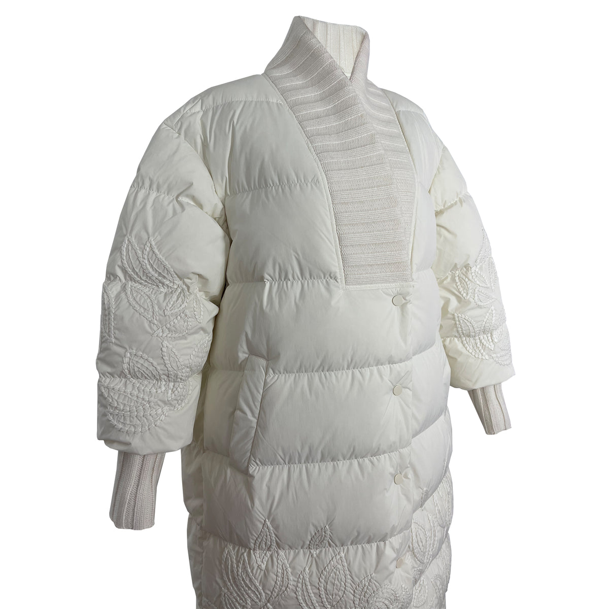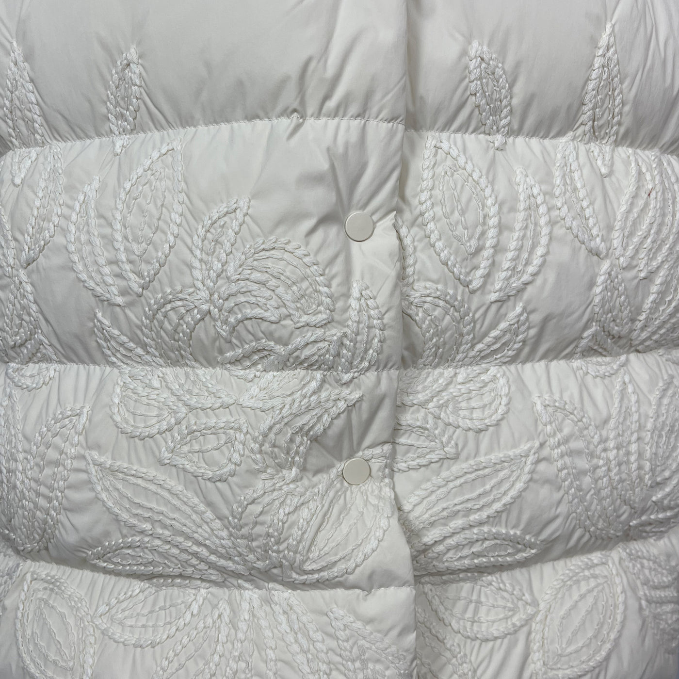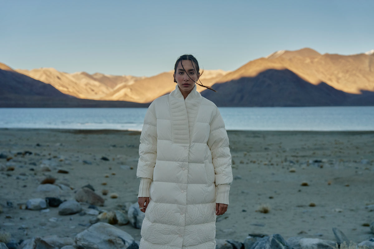 The Ecru Puffer Jacket is a perfect blend of warmth, texture, and craftsmanship. It features intricate tone-on-tone embroidery inspired by botanical motifs. The wide ribbed shawl collar and cuffs add a cozy, structured contrast, while the concealed snap buttons and side pockets ensure ease and functionality. Style it over sleek separates or layer it with knitwear for a luxe, modern winter look.