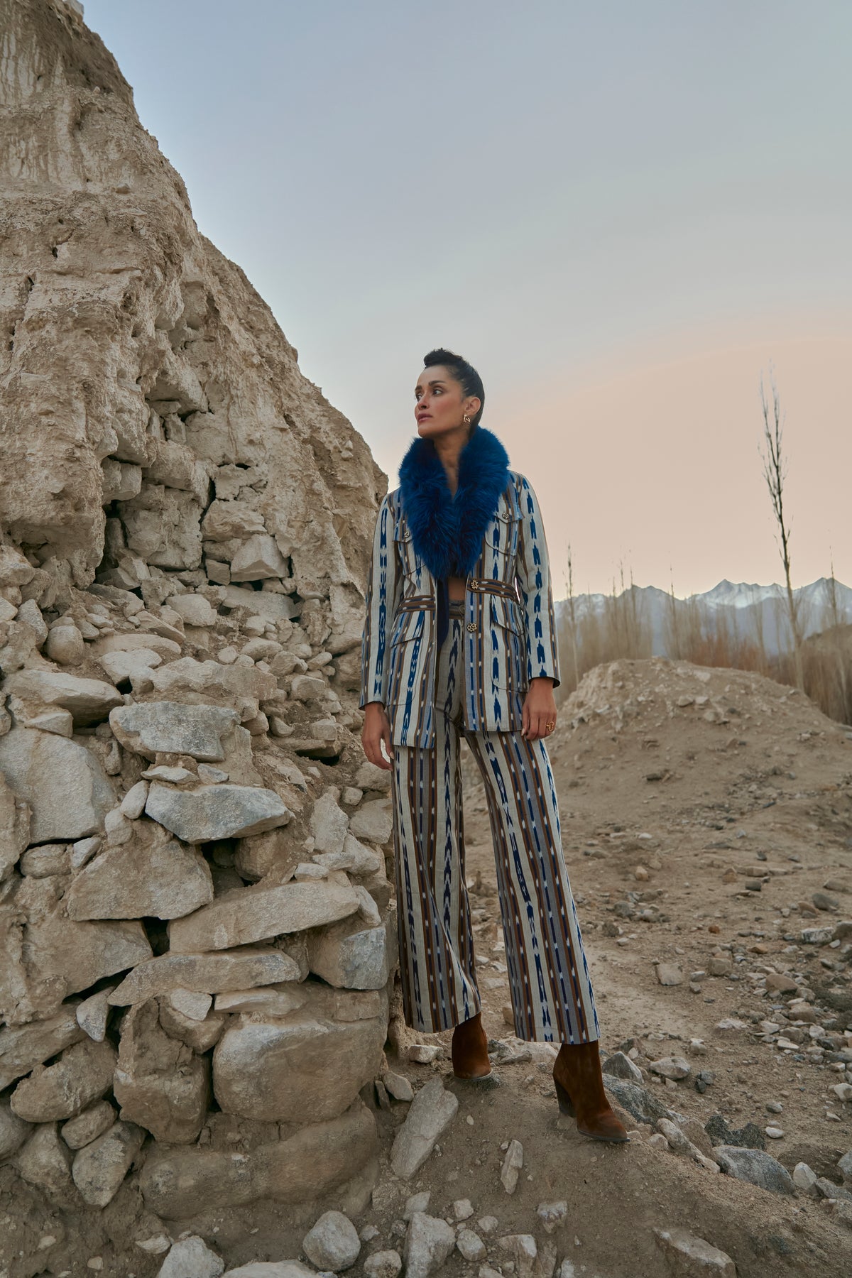 The high waisted Niebla Pants are crafted in handwoven double ikat cotton from South India. It features woven stripes in earthy tones of blue and brown, front patch pockets and a bone button closure. It's a versatile piece which pairs perfectly with crisp shirts or relaxed knits.