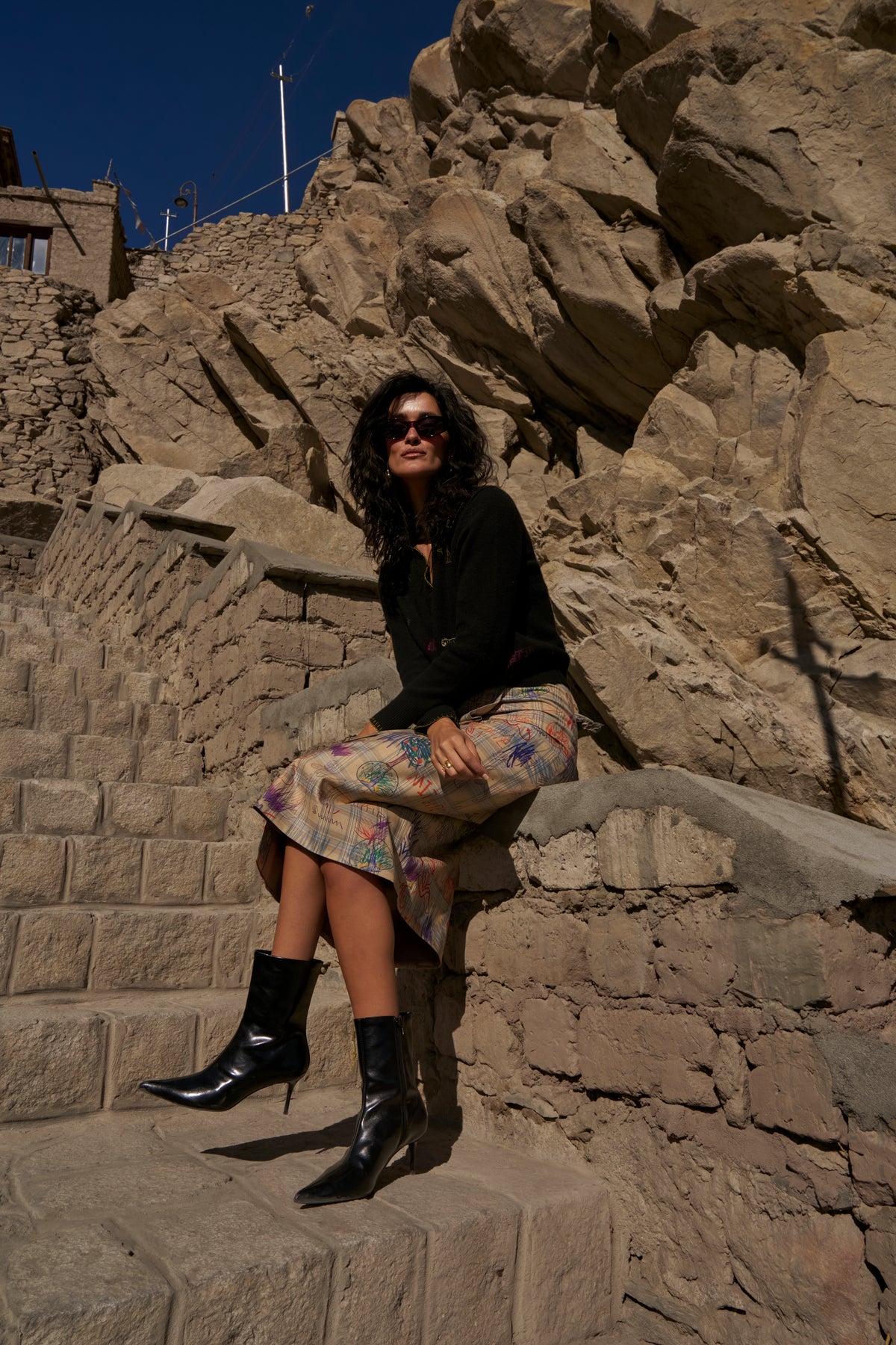 Introducing the Playground Plaid Skirt, a one-of-a-kind skirt meticulously designed with a beige plaid pattern, adorned with playful child art and doodle motifs in vibrant colors. This A line skirt features a wrap around silhouette with back concealed zipper closure.